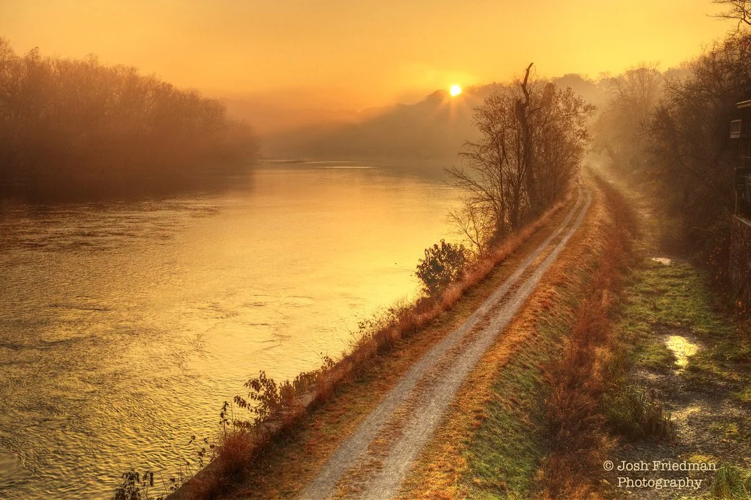 A misty sunrise over a serene river, lined with trees on both sides, and a gravel path running alongside the water.