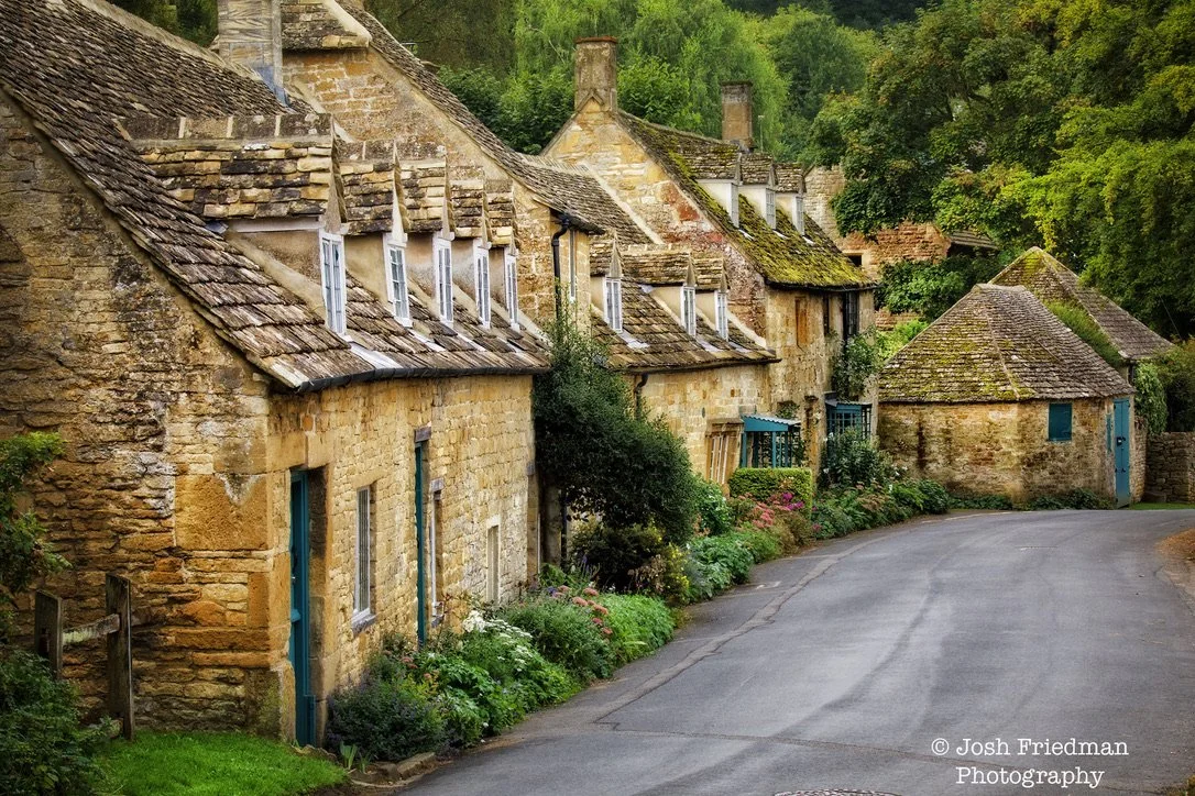 Quaint stone cottages with sloped, moss-covered roofs lining a narrow road, surrounded by lush greenery and flower gardens.