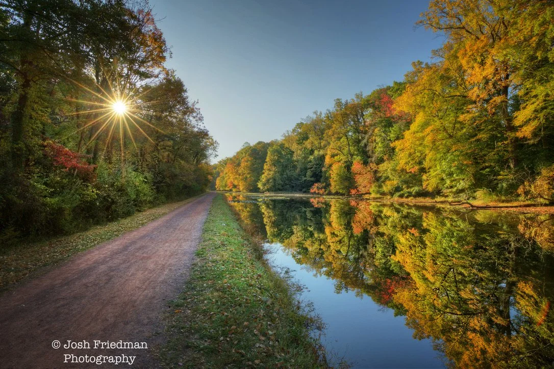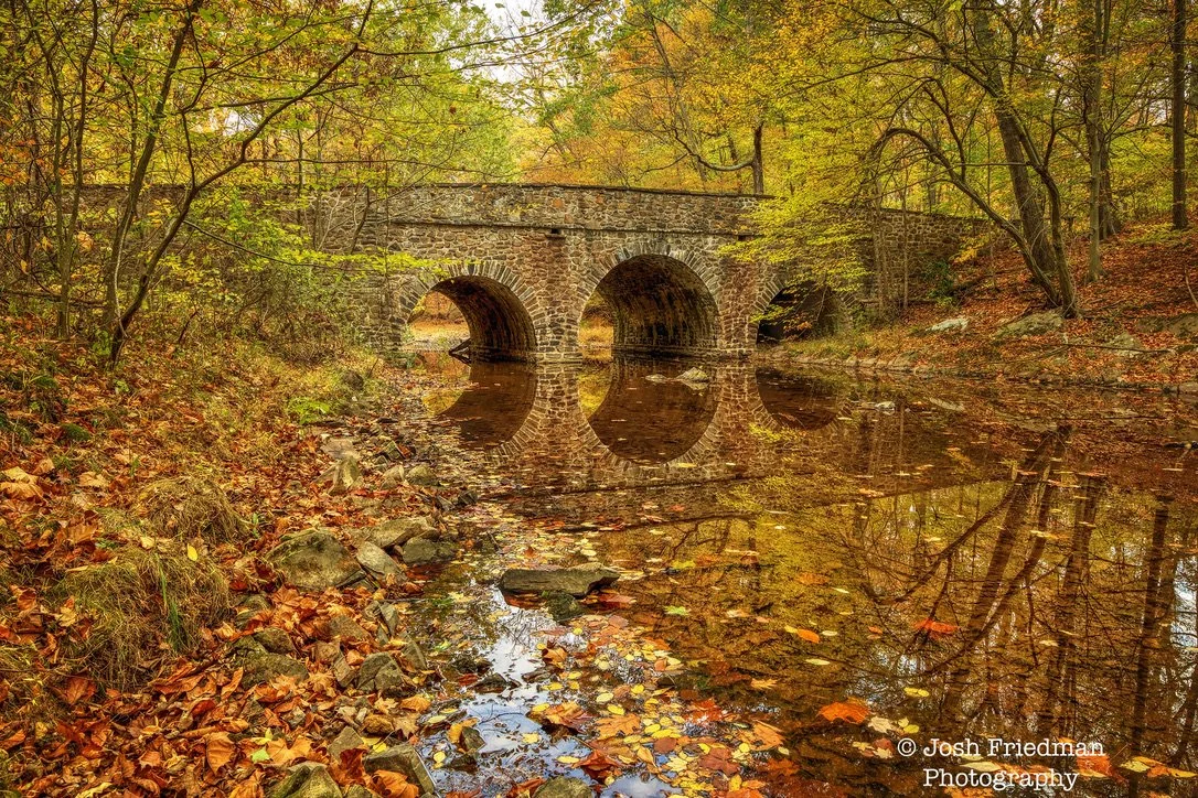 Autumn photograph of the Stone Arch Bridge in Bowman's Hill Wildflower Preserve, in Bucks County, Pennsylvania.  Photograph by Josh Friedman. .