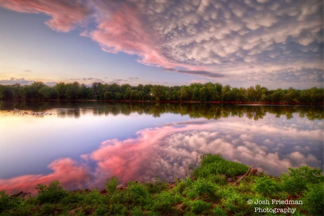 Lake with vibrant sunrise clouds and reflection, surrounded by trees and greenery.