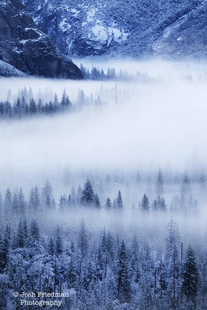 Yosemite Valley covered in fresh snow, with early morning fog. Photograph by Josh Friedman