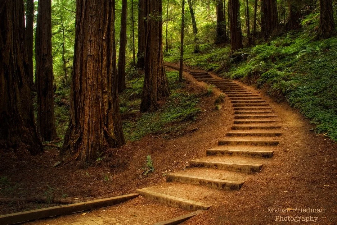 Forest path with wooden steps surrounded by tall trees and green foliage.