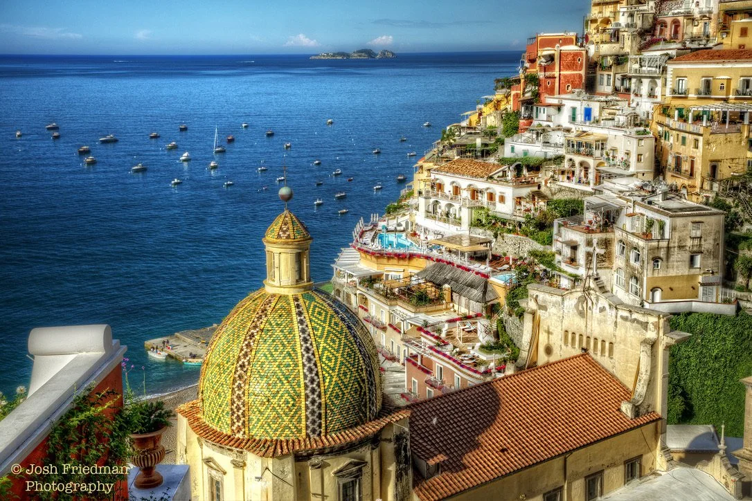 Scenic view of Positano, Italy, showing colorful cliffside buildings, a domed church, and the Amalfi Coast with boats on the sea.