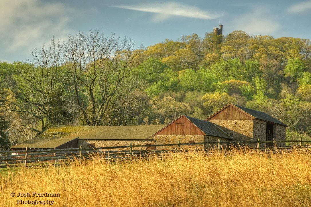 Stone barn in a lush rural landscape with grassy field, wooden fences, and a forested hill in the background.