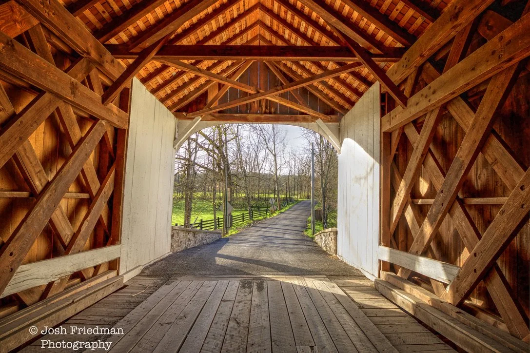 Inside view of a wooden covered bridge with a road leading into a wooded landscape.
