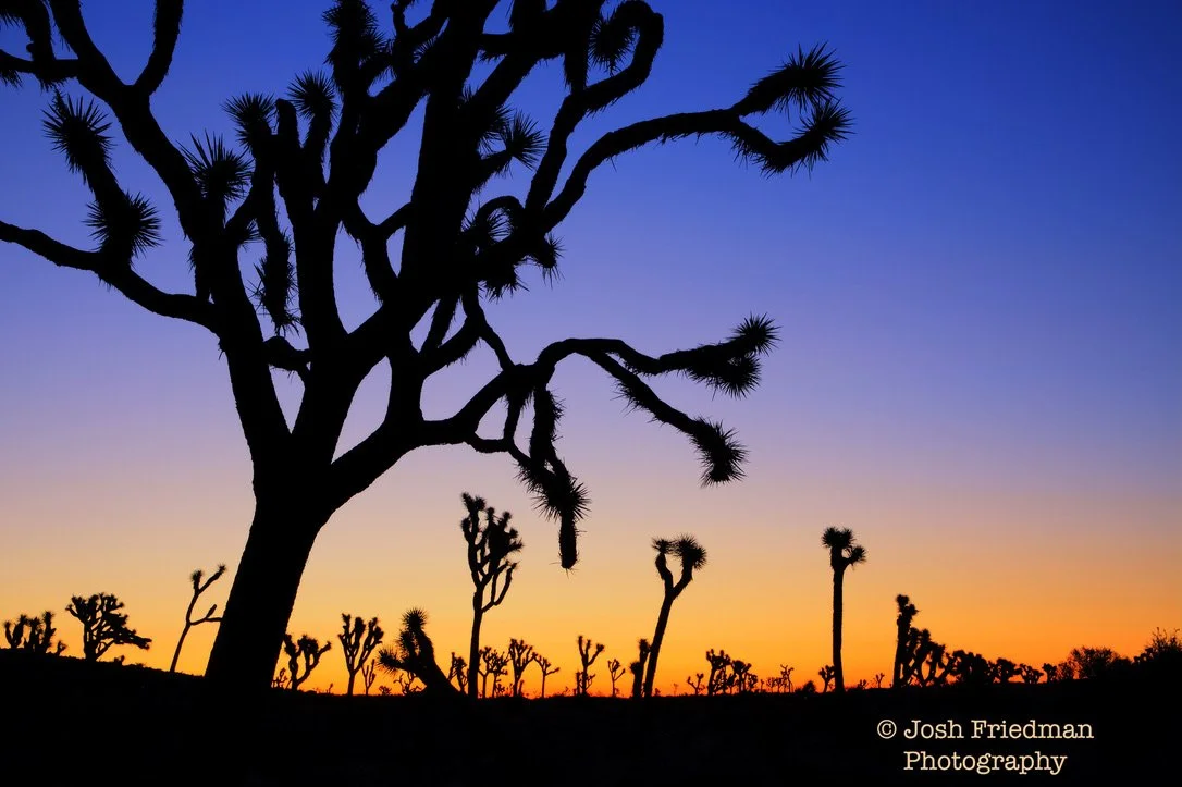 Silhouette of Joshua trees against a vibrant sunset sky featuring orange and blue hues.