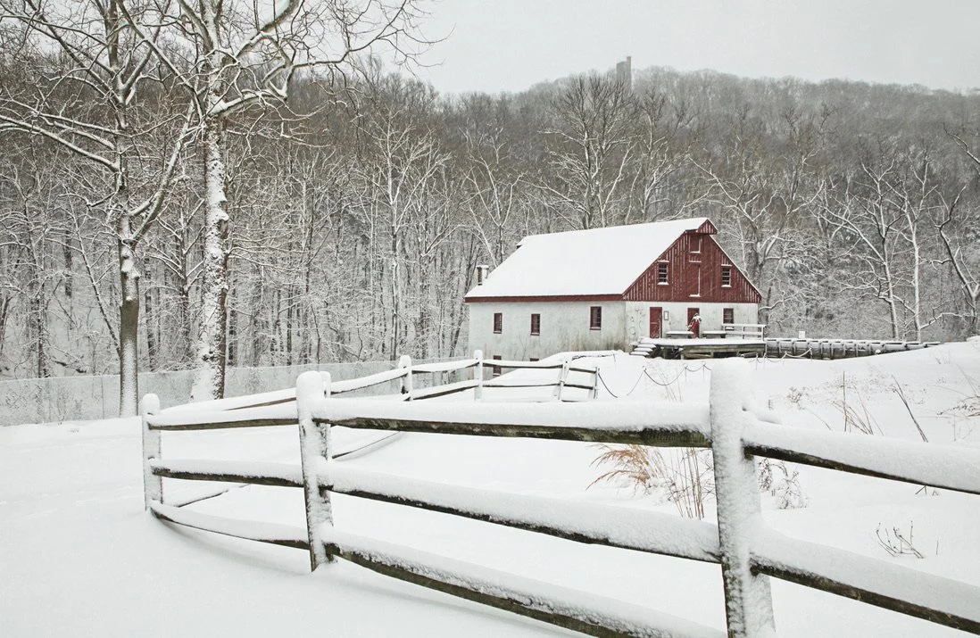 Snow-covered barn with red roof, surrounded by wooden fence and trees, in a winter landscape.
